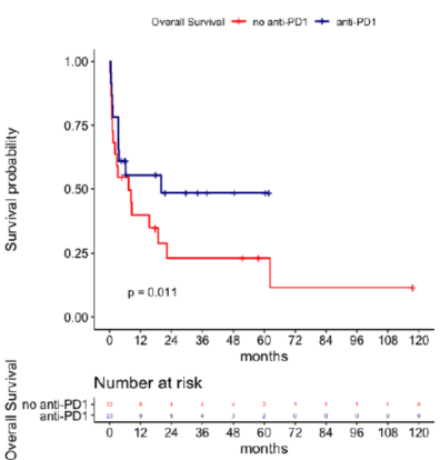 研究人员还通过统计学方法与既往单纯化疗方案治疗结果进行了比较,发现两组患者的PFS近似,但OS差异显著(48.4%vs 23.1%,P=0.011,图1),远期OS率翻了一倍多。研究者认为PD-1抑制剂可以与目前的治疗手段联用,提高了复发难治NKT淋巴瘤整体生存效果,并且毒性可控。但毕竟这项研究为回顾性研究,例数较少,所以研究者认为,未来值得进行包含PD1单抗的前瞻性免疫治疗临床研究。