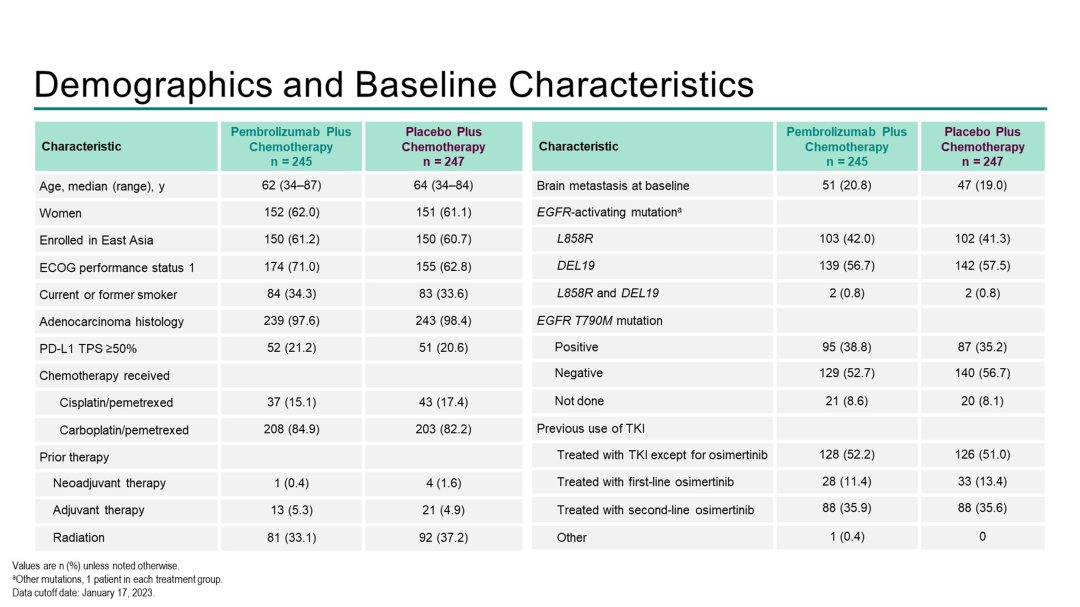 KEYNOTE-789试验纳入了接受第一代或第二代EGFR-TKI治疗且无T790M突变,或者接受过第一代或第二代EGFR-TKI治疗且有T790M突变且奥希替尼治疗失败的转移性非鳞状EGFR突变NSCLC患者。共计492例患者被随机分配接受化疗+帕博利珠单抗或安慰剂+帕博利珠单抗治疗。双重主要终点是基于RECIST v1.1标准通过盲法独立中央审查(BICR)评估的PFS和OS。次要终点包括基于RECIST v1.1标准BICR评估的总体缓解率(ORR)和缓解持续时间(DOR),以及安全性和患者报告结局。患者按PD-L1 TPS(<50% vs≥50%)、治疗史(奥希替尼vs无奥希替尼)和地理区域(东亚vs非东亚)进行分层。