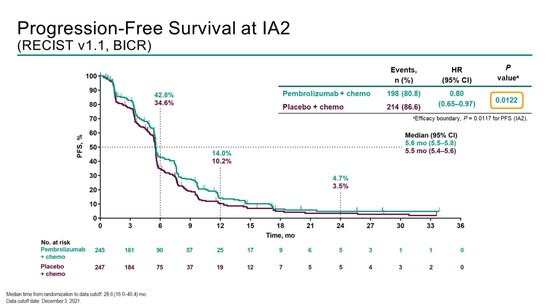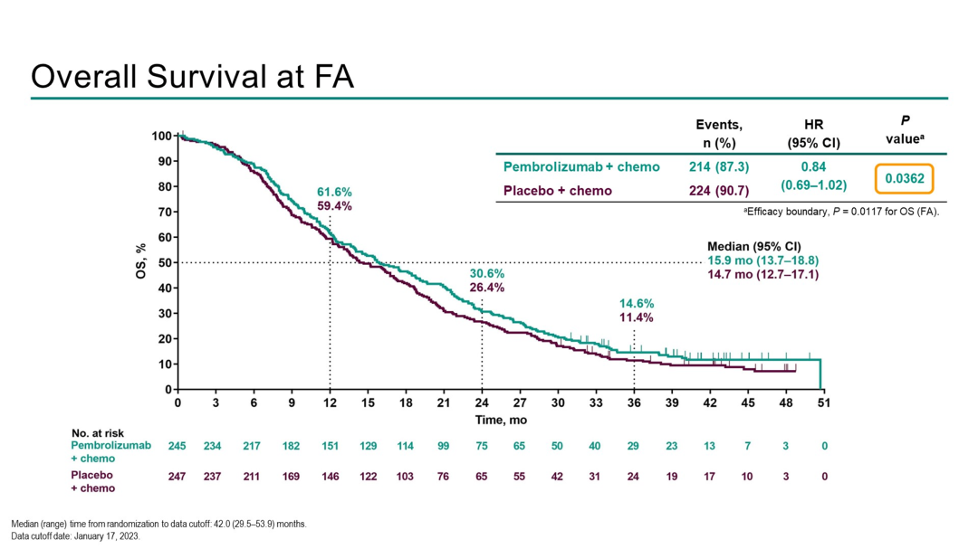 中位随访42.0个月后,帕博利珠单抗+化疗组和安慰剂+化疗组的中位PFS分别为5.6个月和5.5个月(HR=0.80, 95% CI [0.65, 0.97];P=0.0122),中位OS分别为15.9个月和14.7个月(HR=0.84, 95% CI [0.69, 1.02];P=0.0362)。在两项分析中,P值均未达到预设的疗效界值P=0.0117。两组的24个月PFS率为4.7%和3.5%,3年OS率分别为14.6%和11.4%。