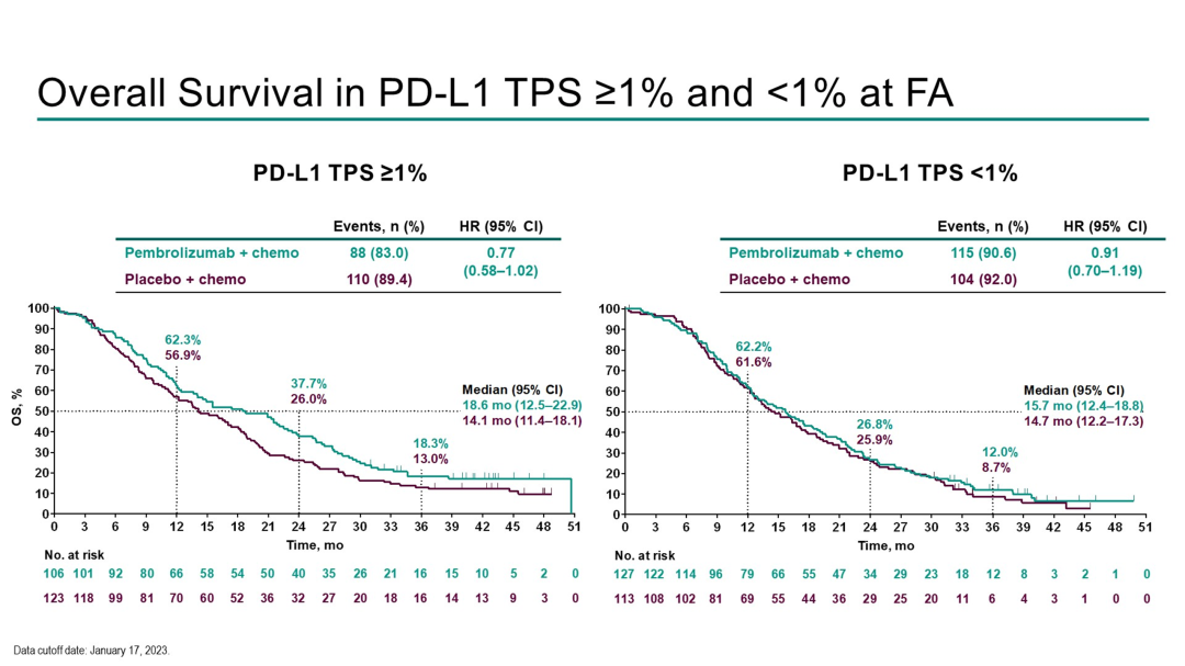 研究者确实注意到,在PD-L1肿瘤比例评分(TPS)≥1%的患者亚组中,帕博利珠单抗有较大获益的趋势,中位OS分别为18.6个月和14.1个月(HR=0.77, 95% CI [0.58, 1.02]),但这一情况也未达到统计学显著性。研究者希望进一步研究化疗+免疫疗法对PD-L1表达较高的患者是否有更大的益处。
