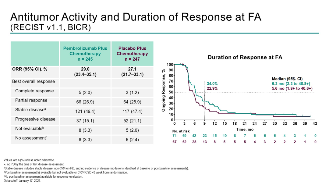 帕博利珠单抗+化疗组和安慰剂+化疗组的ORR分别为29.0%和27.1%;中位DOR分别为6.3和5.6个月,9个月DOR率分别为34.0%和22.9%。