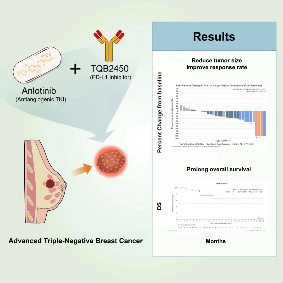 本项Ib期试验旨在探讨PD-L1抑制剂TQB2450联合安罗替尼治疗晚期TNBC患者的安全性和初步疗效。