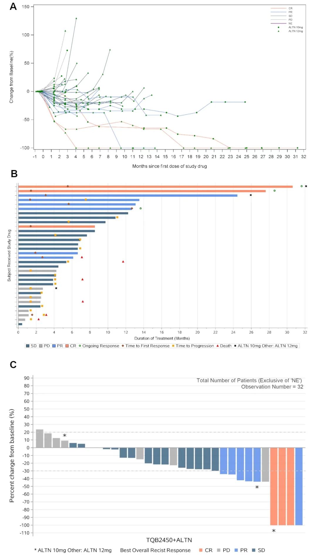 下图展示了缓解持续时间(DoR)的蜘蛛图和游泳图,以及肿瘤大小尺寸相对于基线的最佳变化瀑布图。