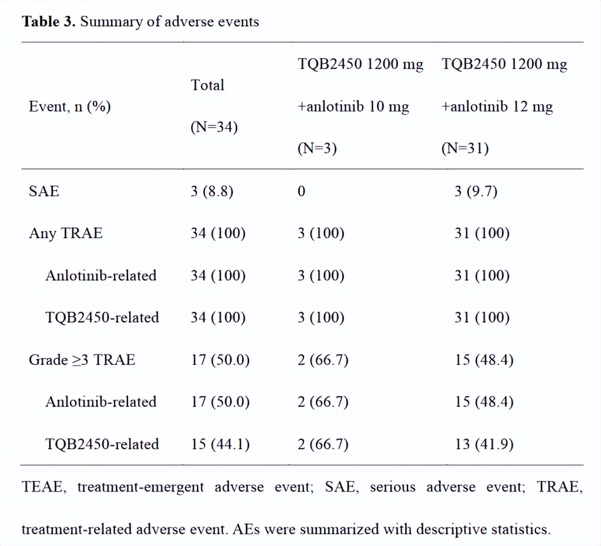 三名患者因不良事件(AE)导致安罗替尼剂量降低,分别为口腔粘膜炎、手足综合征和食欲不振。没有患者因AE停止研究治疗。