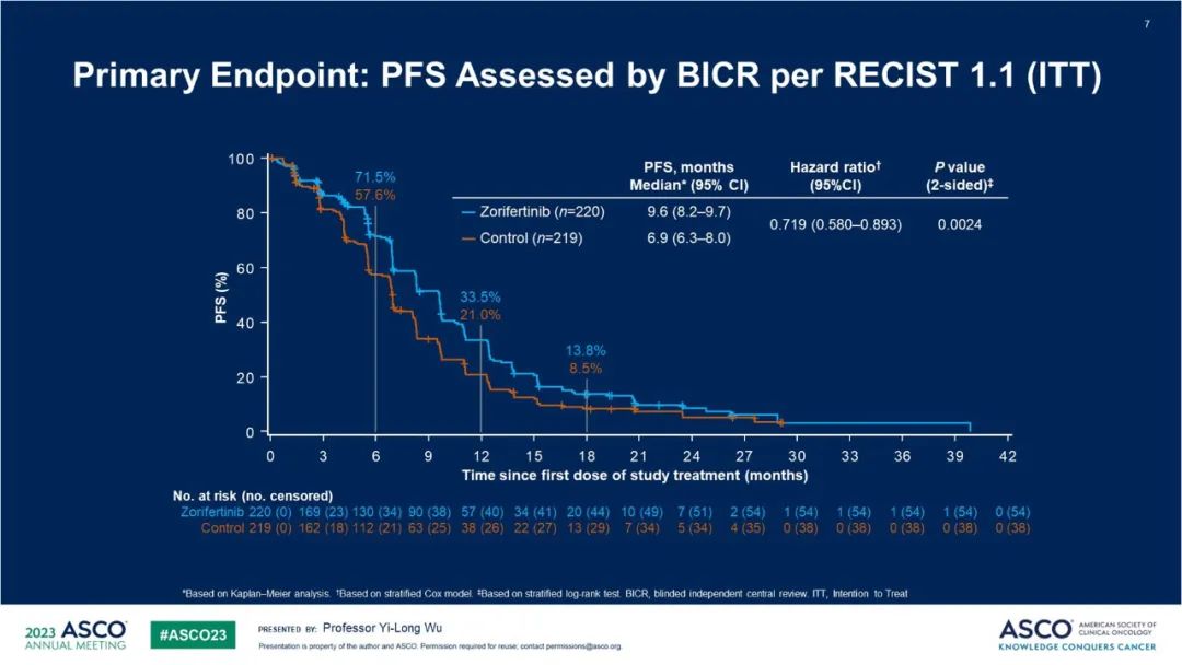 2023 ASCO年会报道的一项开放标签、多中心、随机对照III期试验对比了佐利替尼和一代EGFR-TKIs一线治疗伴CNS转移EGFR突变(L858R和/或Ex19Del)NSCLC患者的疗效和安全性。2019年2月1日至2021年1月12日,该研究将439例MRI确认的CNS转移患者(无症状/症状稳定)1∶1比例随机分组,220例患者接受试验组的佐利替尼(200mg,每日2次)治疗,219例进入对照组接受一代EGFR-TKIs(吉非替尼250 mg或厄洛替尼150 mg,每日1次)治疗。主要研究终点是盲态独立中心评估(BICR)根据RECIST 1.1确定的无进展生存期(PFS)。截至2022年7月12日,两组患者的中位随访时间均为20.4个月。