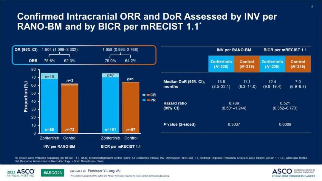 研究者评估的颅内ORR在试验组和对照组分别为75.6%和62.3%,中位颅内DoR分别为13.8个月和11.1个月;BICR确认的颅内ORR分别为75% vs 64.2%,颅内DoR分别为12.4个月 vs 7个月。