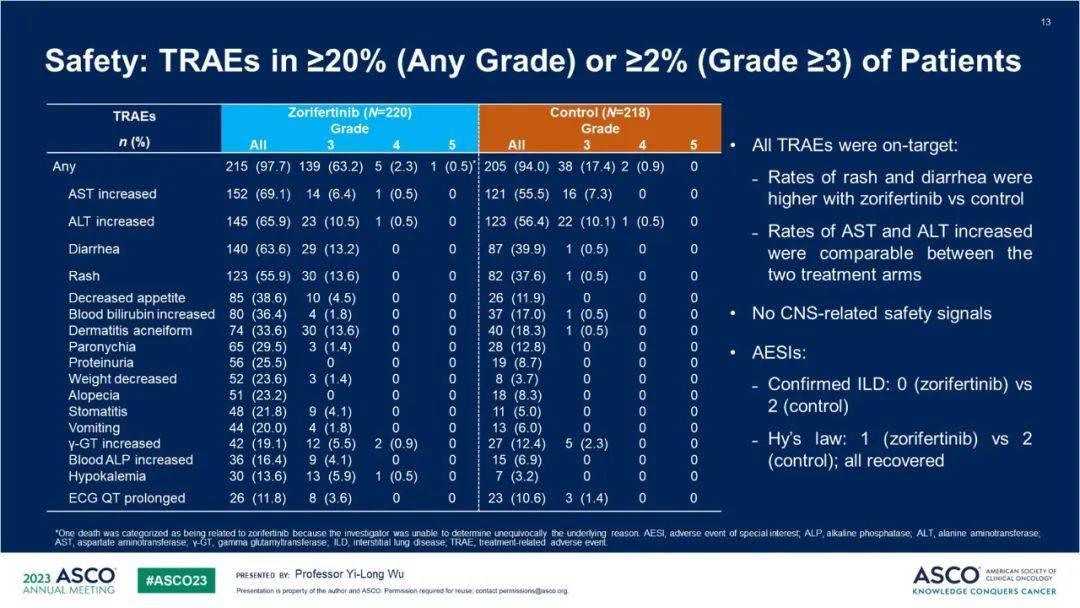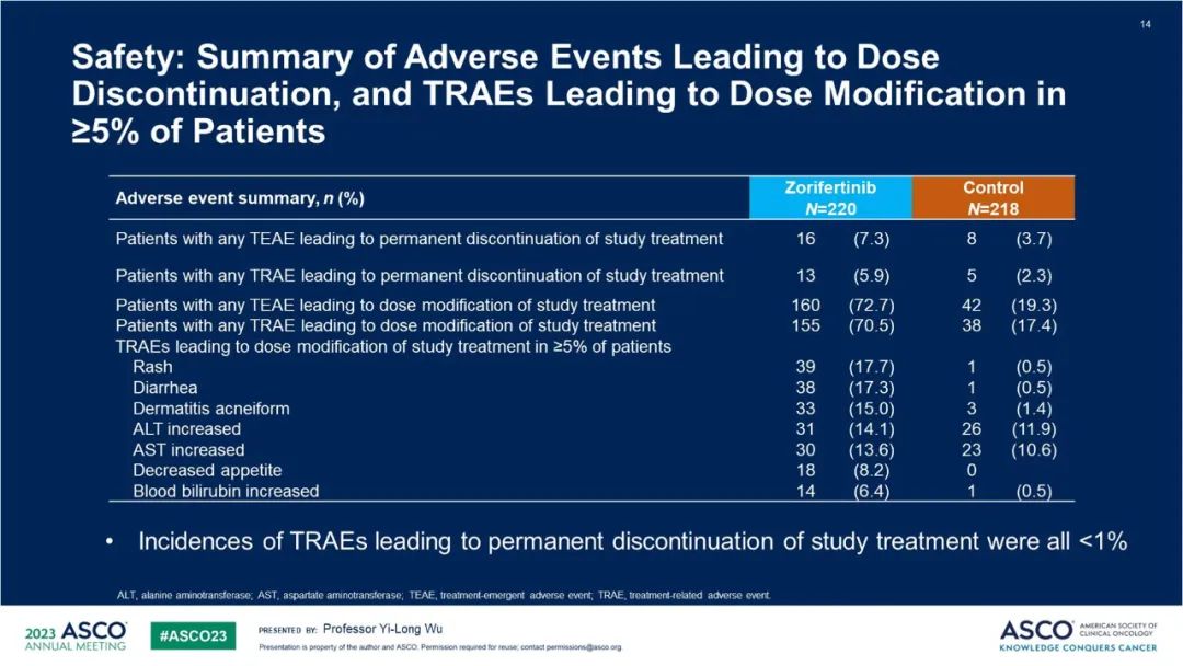 未发现新的不良反应信号。两组间任意级别治疗相关不良反应(TRAEs)发生率相似(97.7% vs 94%)。3级以上TRAEs发生率分别为65.9%(试验组)和18.3%(对照组)。TRAEs主要包括皮肤和皮下组织不良反应、胃肠道反应和肝功能异常,皮疹(55.9% vs 13.6%)和腹泻(63.6% vs 13.2%)的发生率在试验组更高,丙氨酸氨基转移酶(ALT)和天门冬氨酸氨基转移酶(AST)升高的发生率在两个治疗组相当,没有CNS相关的安全性信号。佐利替尼组发生剂量降低或暂停用药的患者比例较高,最终导致研究治疗终止的TRAE发生率为5.9%。