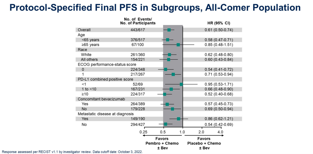 吴令英教授:这次KEYNOTE-826研究报告了最终OS结果,我们可以看到最终的OS和PFS与既往IA1结果保持一致,总体人群、CPS≥1、CPS≥10的患者是有较为明确的生存获益;但CPS<1的患者样本较小,仅占总体人群的11%,作者也没有过多地分析这部分人群的数据,但在亚组森林图显示OS(HR 0.87)和PFS(HR 0.95)获益有限。