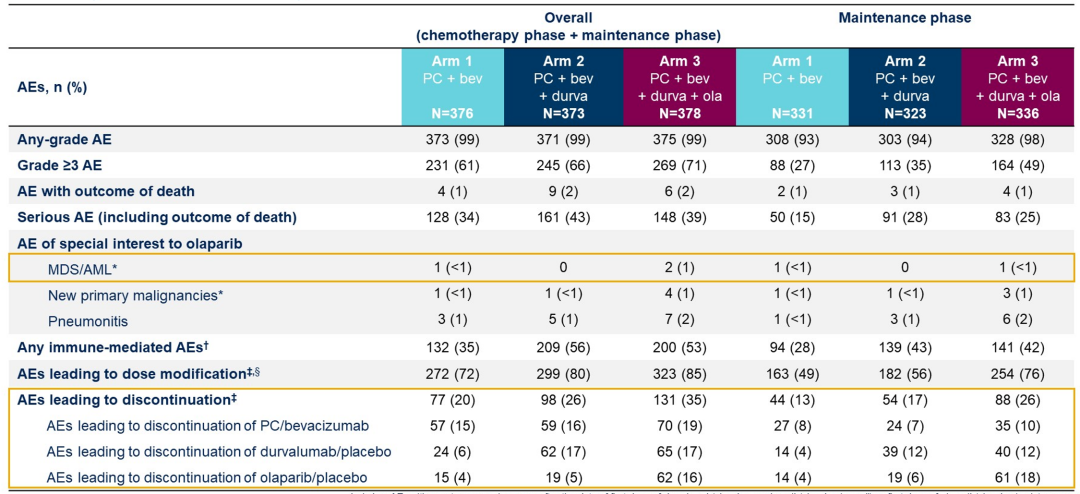 吴令英教授:非常高兴能够参加本次盛会。正如你所提到的,这次ASCO大会有很多妇科肿瘤领域的研究进展;其中,DUO-O是一项有关一线三药维持治疗用于Non-tBRCAm患者的3期随机对照研究。过去大家都知道,PARP抑制剂(PARPi)在卵巢癌维持治疗中取得了很好的疗效。这项DUO-O研究将PARPi奥拉帕利维持治疗作为对照组,另外两组分别为贝伐单抗+度伐单抗双药组和贝伐单抗+度伐单抗+奥拉帕利三药组。