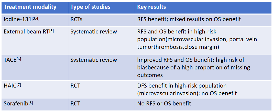 辅助治疗被认为是许多瘤种以治愈为目的的治疗后的标准治疗。肝细胞癌(HCC)仍然是少数没有标准辅助治疗的癌症类型之一。大约 50% 接受手术的肝细胞癌患者在2年内出现疾病复发[1,2]。在过去的20年中,业界已经研究了不同的辅助治疗策略,包括经动脉治疗,放疗和索拉非尼,但这些治疗方法都没有显示出生存结局的持续改善(表1)[3-8]。最近的焦点已转移到评估辅助免疫检查点抑制剂(ICIs)在早期HCC根治性切除或消融后的作用。