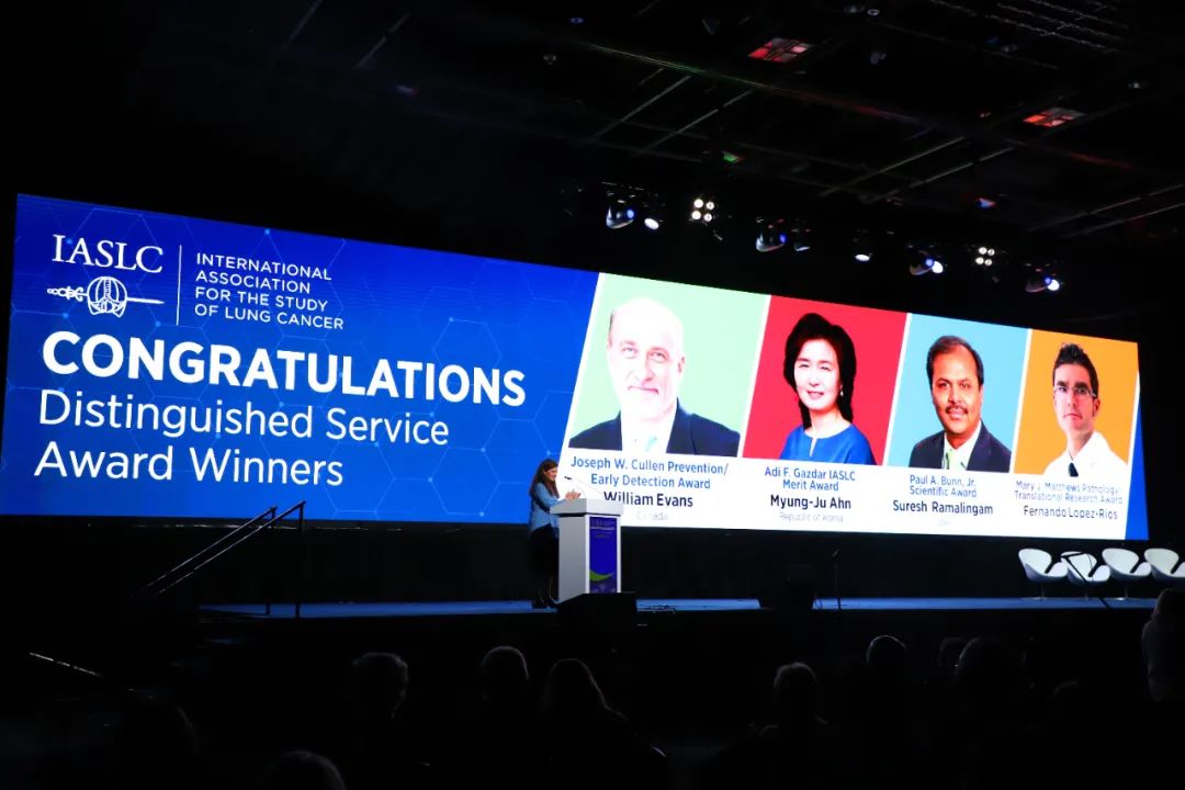 在2023年世界肺癌大会开幕式上,四位胸部肿瘤领域的领军人物受到表彰,大会宣布了IASLC杰出贡献奖(IASLC Distinguished Service Award)的获奖者:来自韩国成均馆大学医学院Myung-Ju Ahn教授获得IASLC荣誉奖(IASLC Merit Award);美国埃默里大学Winship癌症研究所Suresh Ramalingam教授获得IASLC科学奖(IASLC Paul A.Bunn,Jr.Scientific Award);西班牙马德里12 de Octubre大学医院Fernando Lopez-Rios教授荣获IASLC病理/转化研究奖(Mary J.Matthews Pathology/Translation Research Award);IASLC预防/早期筛查奖(IASLC Joseph W.Cullen Prevention/Early Detection Award)被授予加拿大麦克马斯特大学William Evans教授。