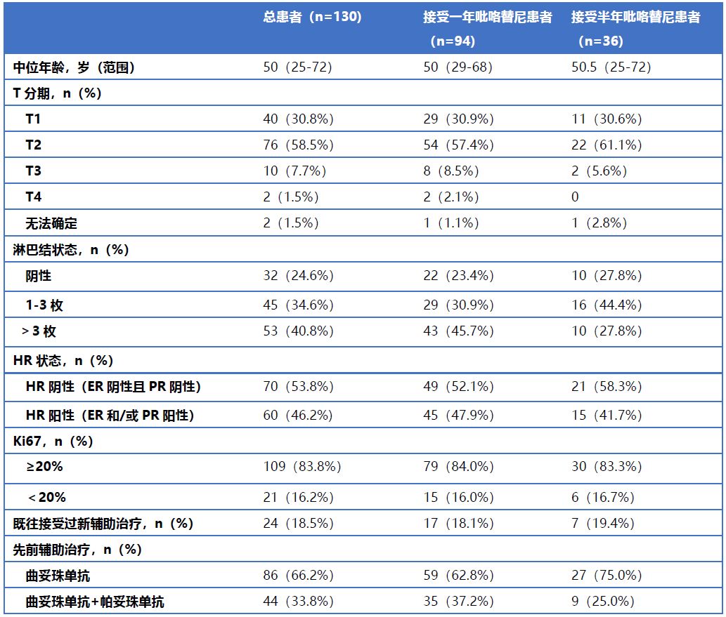 130名患者的中位年龄为50岁;90名患者(69.2%)T分期≥2;98名患者(75.4%)发生淋巴结转移,其中53名患者(40.8%)淋巴结转移>3枚;60名患者(46.2%)为激素受体阳性;24名患者(18.5%)既往接受过新辅助治疗,均未达到pCR;44名患者(33.8%)辅助阶段接受了曲妥珠单抗联合帕妥珠单抗双靶治疗(表1)。