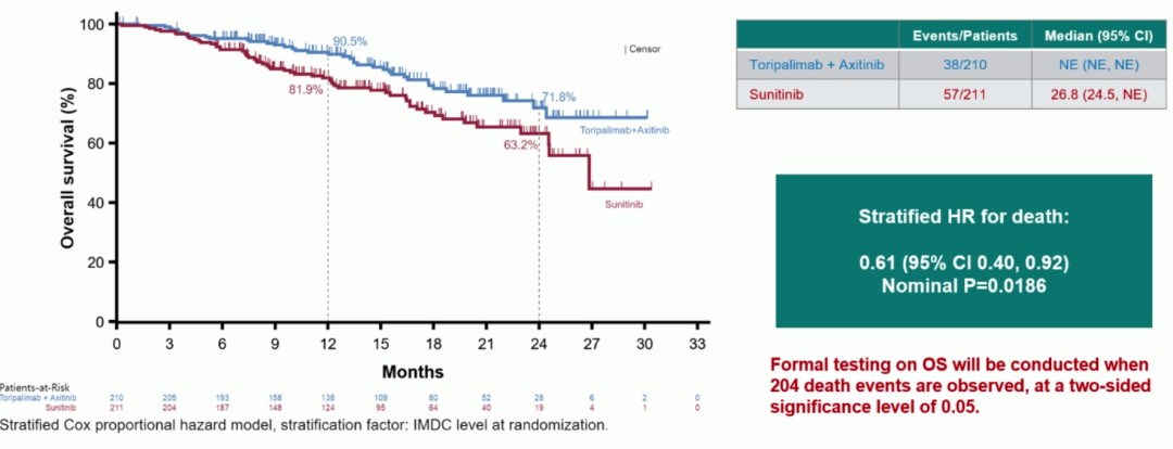 特瑞普利单抗组的客观缓解率(ORR)为56.7%(95%CI:49.7~63.5),而舒尼替尼组为30.8%(95%CI:24.6~37.5)(P<0.0001)。特瑞普利单抗组的中位总生存期(OS)未达到,舒尼替尼组为26.8个月(HR 0.61,95%CI:0.40~0.92,P=0.0186)。