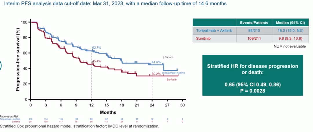 中位随访14.6个月,与舒尼替尼组相比,特瑞普利单抗组的中位PFS显著延长(18.0 vs 9.8个月,HR 0.65,95%CI:0.49~0.86,P=0.0028)。各亚组的PFS获益一致。