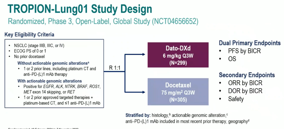 TROPION-Lung01是一项全球性、随机、多中心、开放标签的3期试验,旨在评估Dato-DXd(6.0mg/kg,q3w)对比多西他赛(75 mg/m2,q3w)治疗至少接受过一种既往疗法的局部晚期或转移性非小细胞肺癌(NSCLC)的疗效和安全性,该研究入组患者为ⅢB或Ⅳ期的晚期/转移性NSCLC,伴或不伴AGA,且至少接受过1-2种全身治疗,其中驱动基因阴性患者既往接受过以基于铂类的化疗和抗PD-1/PD-L1联合或序贯治疗;AGA阳性患者接受过基于铂类的化疗和靶向治疗。研究设置了双主要终点,即盲法独立中心审查(BICR)的无进展生存期(PFS)和总生存期(OS)。关键次要终点包括客观缓解率(ORR)、持续缓解时间(DoR)以及安全性等。