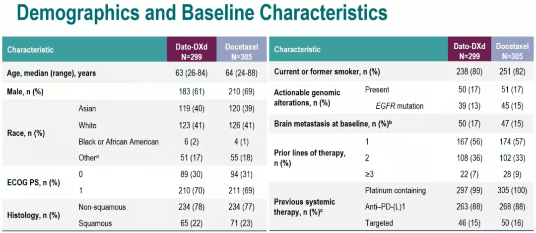 共有604例患者(Dato-DXd组299例,多西他赛组305例)纳入全分析集(FAS),Dato-DXd组和多西他赛组分别有43.1%和42%既往接受过≥2线全身治疗;分别有78%和77%的肿瘤组织学为非鳞NSCLC(nsq-NSCLC),22%和23%为鳞状NSCLC(sq-NSCLC);两组患者均有17%携带AGA;