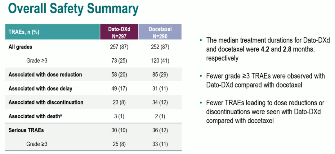 在安全性方面,该研究未发现Dato-DXd存在新的安全信号。相较于多西他赛组,Dato-DXd组患者的≥3级治疗相关不良事件(TRAEs)发生率(25%vs 41%)更低,Dato-DXd组患者导致剂量减少的TRAEs(20%vs 29%)和导致治疗中止的TRAEs(8%vs 12%)发生率更低。