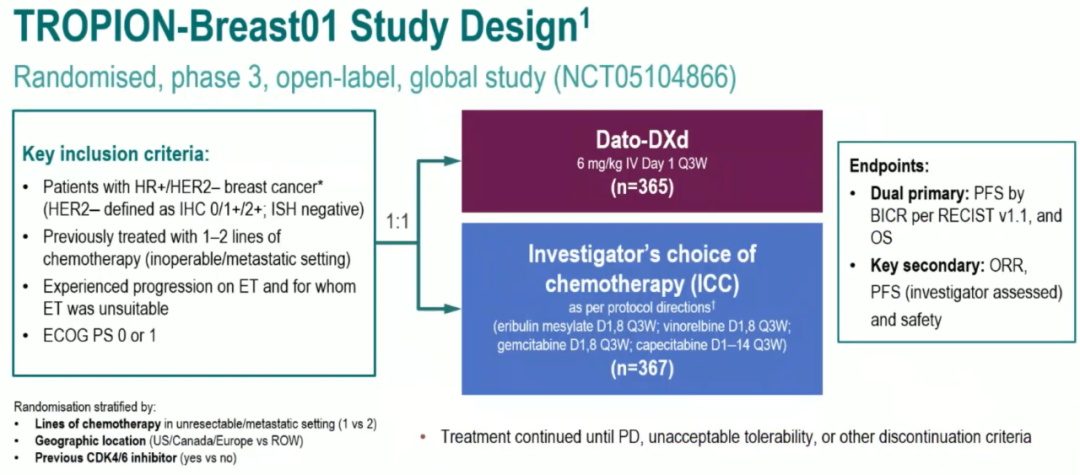 这是一项全球、随机、多中心、开放标签的3期临床试验,旨在评估Dato-DXd(6.0mg/kg,q3w)对比研究者选择的单药化疗(ICC,艾立布林、卡培他滨、长春瑞滨或吉西他滨)的疗效和安全性,入组患者为既往内分泌治疗进展或不适合内分泌治疗(必须至少接受过1-2线化疗)的不可手术切除或转移性HR阳性、HER2低表达或阴性(IHC 0,1+或IHC 2+/ISH-)晚期乳腺癌。该研究同样采用双主要研究终点设计,分别为BICR评估的PFS以及OS。关键次要终点包括ORR、研究者评估的PFS和安全性等。