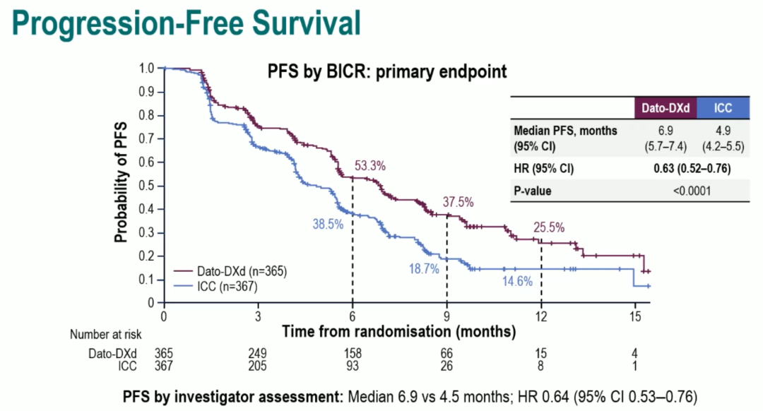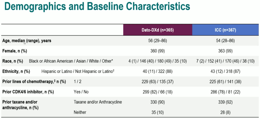 研究共入组732例患者(Dato-DXd组365例,ICC组367例)。基线特征如下图所示,两组患者基线保持平衡,Dato-DXd组和ICC组既往接受过1线/2线治疗的比例分别为82%/18%和61%/38%;既往接受过CDK4/6i治疗的比例分别为82%/18%和78%/22%。