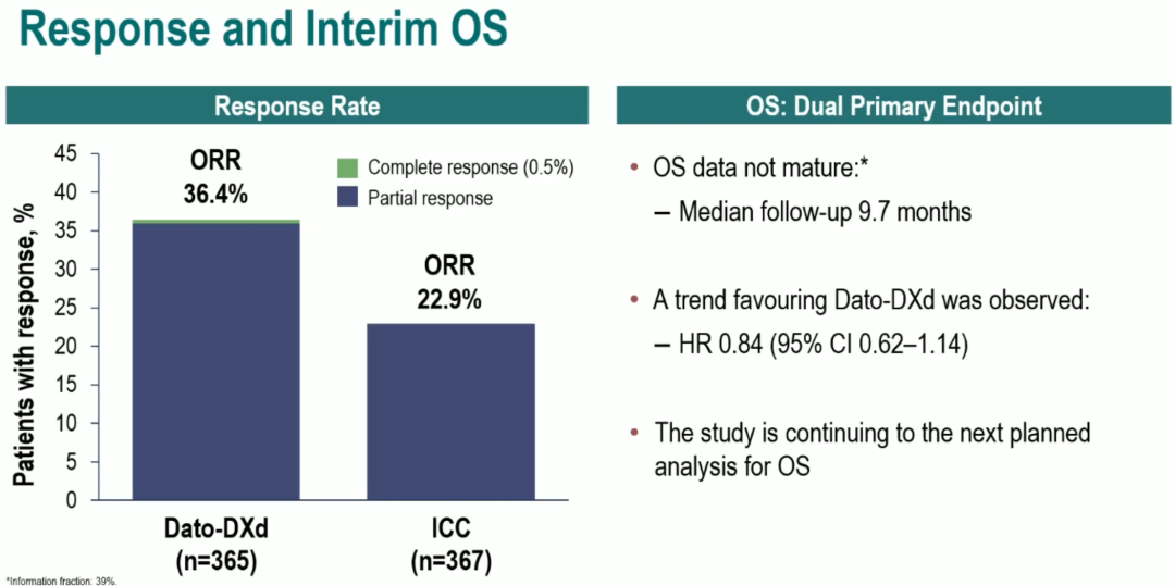 Dato-DXd组和ICC组的ORR分别为36.4%和22.9%;OS数据尚未成熟,已观察到Dato-DXd组的获益趋势(HR 0.84,95%CI:0.62~1.14)。