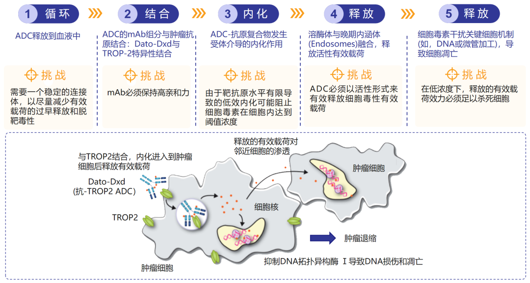 Dato-DXd是由人源化Trop-2 IgG1单克隆抗体,通过可裂解的四肽连接子与拓扑异构酶I抑制剂有效载荷DXd偶联而成,具有:有效载荷活性高,优化药物抗体比(DAR≈4),有效载荷的系统半衰期短,循环稳定且可选择性裂解的连接子,以及抗肿瘤“旁观者效应”等药物优势。