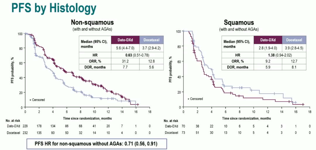 Dato-DXd在nsq-NSCLC人群中观察到令人惊喜的临床获益,患者具有更长的中位PFS(5.6 vs 3.7个月),进展或死亡风险降低37%(HR 0.63;95%CI:0.51~0.78);Dato-DXd组确认的ORR为31.2%,包括4例完全缓解(CR)患者,多西他赛组ORR为12.8%,没有观察到CR患者;