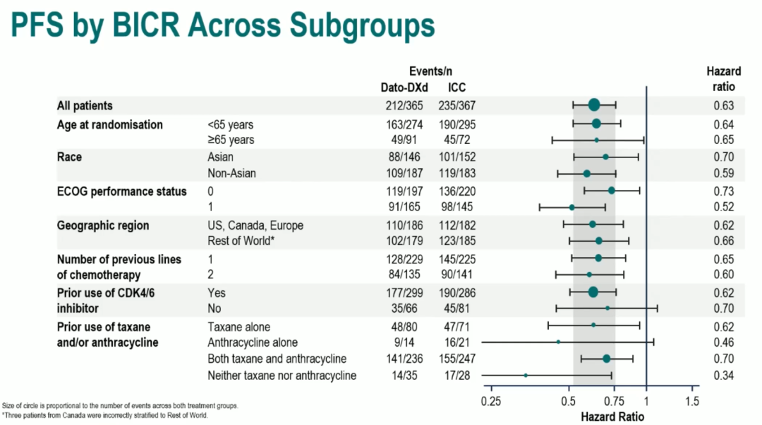 至数据截止时(2023年7月17日),Dato-DXd组和ICC组中分别有93例和39例患者仍在接受治疗。Dato-DXd组和ICC组患者的中位PFS分别为6.9个月和4.9个月,Dato-DXd组患者的疾病进展或死亡风险相较于ICC组显著降低37%(HR 0.63,95%CI:0.52~0.76;P<0.0001)。亚组分析显示,不同亚组患者的PFS获益趋势一致。
