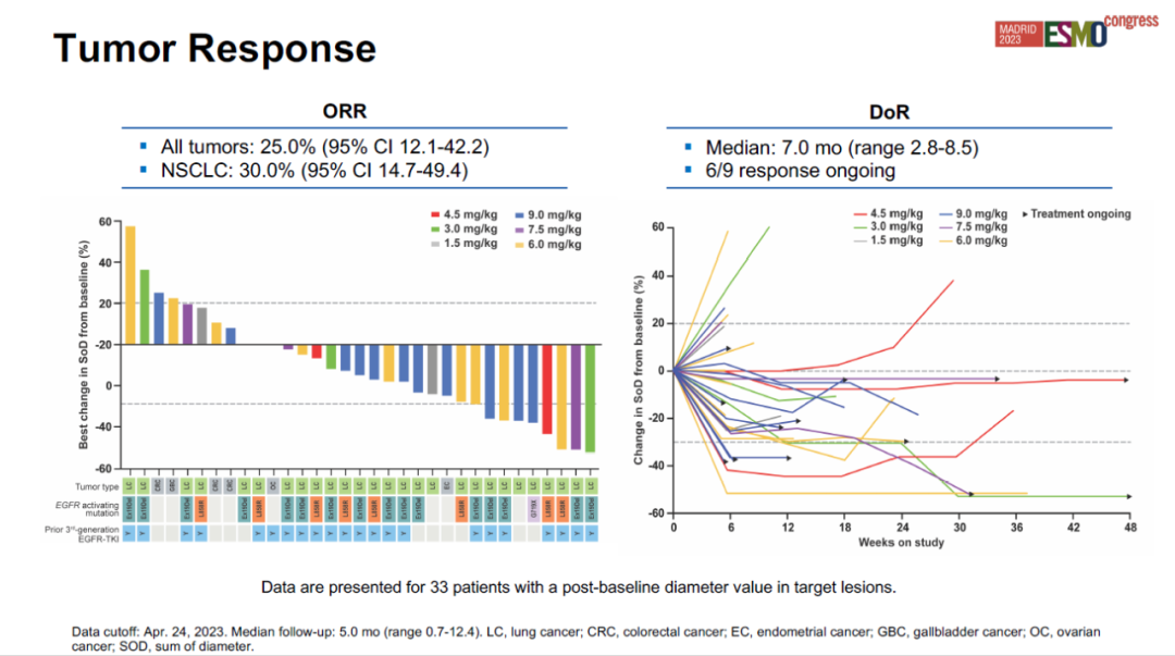 At data cutoff (Apr 24, 2023), 42 pts were enrolled (ECOG 1, 83.3%; stage IV, 100%; NSCLC, 85.7%; brain metastasis, 31.0%); median prior lines of systemic therapy was 3 (range, 1-11). Among 36 NSCLC pts, 34 (94.4%) had EGFR mutations; all were resistant to EGFR-TKI, with 85.3% (29/34) previously treated with 3rd generation agents. Up to 10.5 mg/kg, no DLT was observed; dose-escalation is ongoing. Grade≥3 TRAEs were reported in 13 (31.0%) pts, with all occurring in ≥5% being hematotoxicities. TRAEs led to drug discontinuation in 3 (7.1%) pts. Interstitial lung disease occurred in 2 (4.8%) pts. In evaluable pts, ORR was 25.0% (9/36; 95% CI 12.1-42.2) across all tumor types and 30.0% (9/30; 95% CI 14.7-49.4) in NSCLC; median DoR was 7.0 mo (range, 2.8-8.5) in both pt sets. Tumor response by dose is shown in the table. 1. 6-mo PFS rate was 46.4% (95% CI 27.0-63.8) across all tumors and 49.8% (95% CI 28.8-67.8) in NSCLC. Systemic exposure of SHR-A2009, total antibody and free toxin increased approximately dose proportionally after single/multiple doses at 1.5-9.0 mg/kg; plasma toxin exposure was low across all levels (data not available for 10.5 mg/kg). Table: 658MO