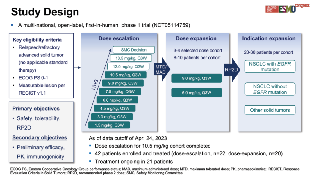 SHR-A2009 was given at doses of 1.5-10.5 mg/kg (Q3W, iv) in an i3+3 dose escalation scheme, followed by cohort expansion at selected doses. The primary endpoints were MTD/MAD, RP2D and safety.