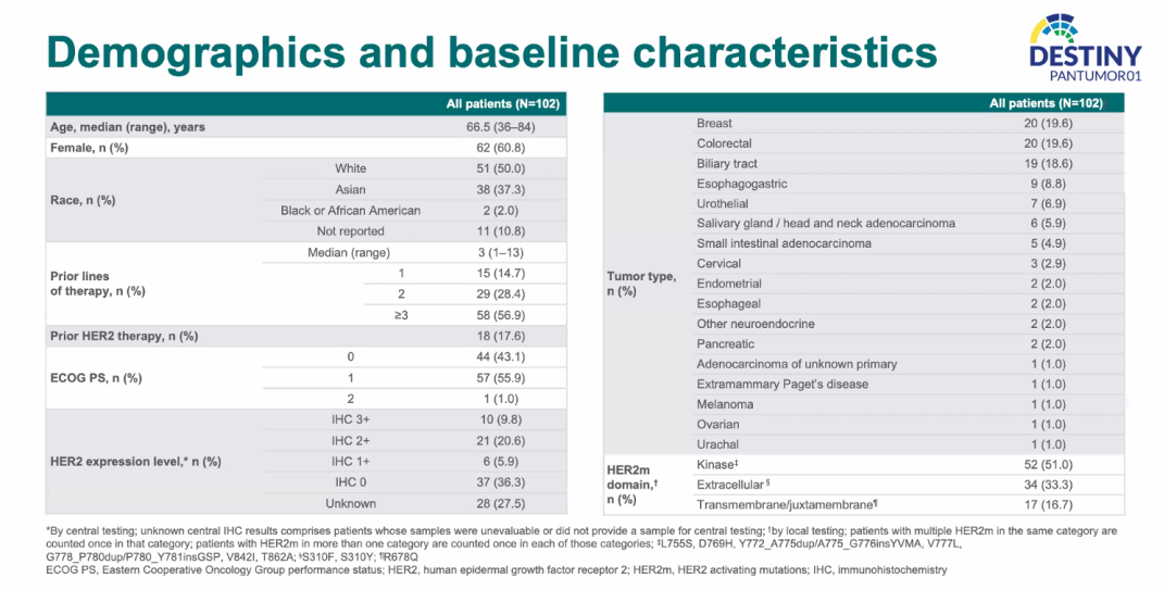 本研究共有102例乳腺癌、结直肠癌、胆管癌等实体瘤患者参与研究并纳入分析,中位年龄66.5岁(36-84岁),中位前序治疗线序为3线(1-13线),17.6%的患者曾接受抗HER2治疗,中心评估后9.8%的患者为HER2 IHC3+,36.3%患者为IHC 0。其中51.0%为激酶区HER2m、33.3%为胞外区HER2m、16.7%为跨膜区/膜旁结构HER2m。