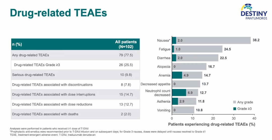 在安全性方面,T-DXd并未发现新的不良事件信号,主要的3度及以上不良事件为中性粒细胞减少(6.9%)、贫血(4.9%)和乏力(2.9%);3级或以上ILD发生率为3%,与既往研究一致。