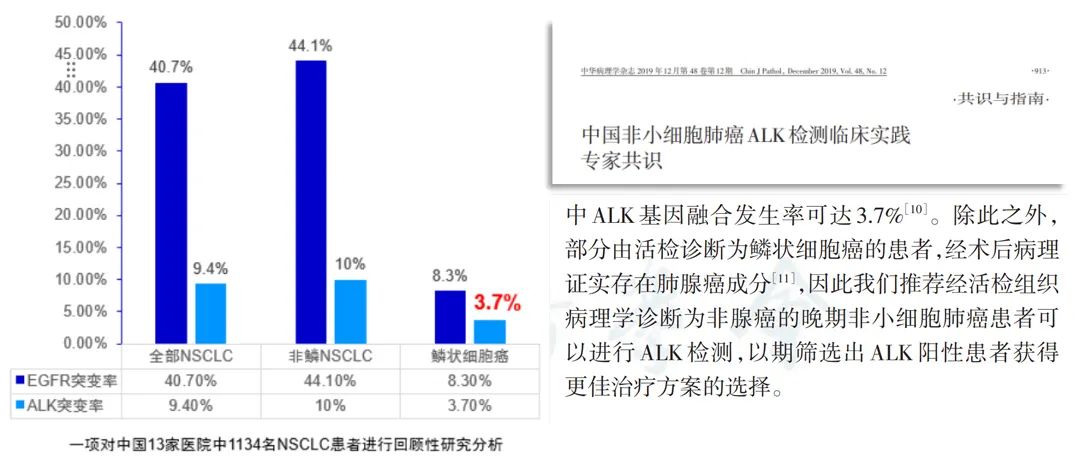 对肺腺癌、经小样本活检诊断鳞癌或混合腺癌成分的患者应进行基因检测。肺浸润性腺癌患者均需进行靶分子基因检测。很多医生不重视鳞癌患者的基因检测,然而部分由活检证实为鳞状细胞癌的患者,经术后病理证实存在肺腺癌成分,而且近些年来,肺鳞癌中的驱动基因检出率也在逐步提高,包括常见基因EGFR和ALK,有研究显示鳞癌患者中ALK基因融合发生率可达3.7%[4-5]因此基因检测对鳞癌患者也很重要。靶向治疗相比化疗可为驱动基因阳性NSCLC患者带来PFS和OS显著改善,尤其是ALK突变,临床医生应重视对鳞癌等NSCLC患者进行基因检测,尽量不要让携带驱动基因突变的患者失去靶向治疗的机会。