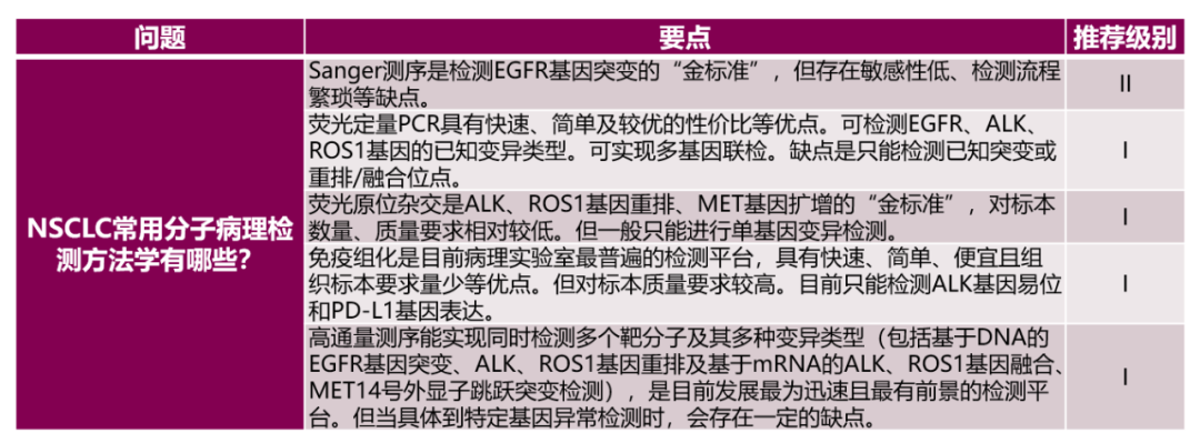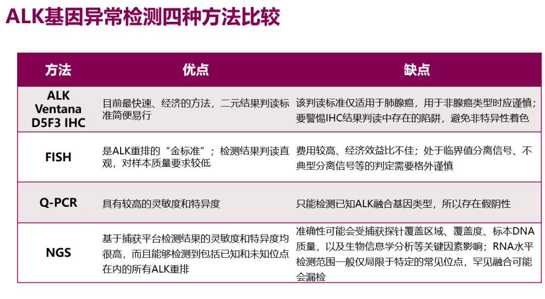NGS:NGS可同时检测多个靶分子及其多种变异类型,包括罕见靶点,目前比较受推崇。NGS检测范围比较广,包括大Panel和小Panel。缺点是目前常用的DNA模板的NGS检测容易漏诊,如果临床采用RNA+DNA NGS检测,可以检测的更全面。