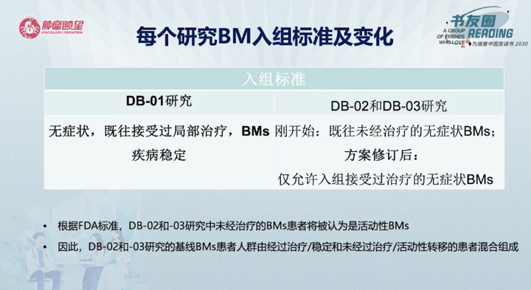 对于脑转移患者入组标准,三项研究中有所区别。DB-01研究入组的患者为无症状,既往接受过局部治疗,脑转移疾病稳定。DB-02、DB-03研究刚开始入组的患者为既往未经治疗的无症状脑转移患者;方案修订后,仅允许入组接受过治疗的无症状脑转移患者。根据FDA标准,DB-02和DB-03研究中未经治疗的脑转移患者将被认为是活动性脑转移,因此,DB-02和DB-03研究的基线脑转移患者人群由经治的/稳定性脑转移和未经治的/活动性转移患者混合组成。
