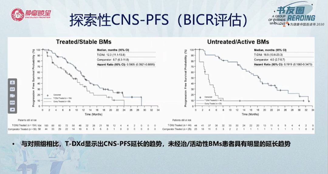 探索性数据显示,T-DXd组和对照组稳定性脑转移患者的CNS-PFS分别为12.3个月和8.7个月;在活动性脑转移患者中这一数据分别为18.5个月和4.0个月。与对照组相比,T-DXd显示出延长CNS-PFS的趋势,对于活动性脑转移患者具有明显的优势。两组脑转移人群中患者的任何PD发生率相当。