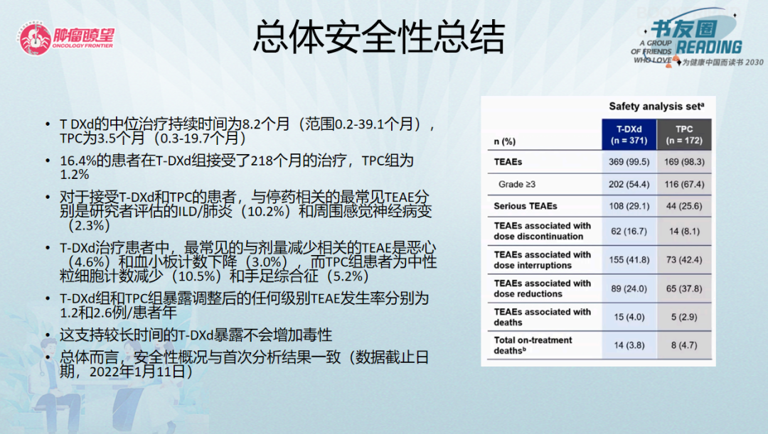 亚组分析结果显示,无论是在HR+队列还是在所有患者中,T-DXd组的OS结果都好于TPC组。对于接受T-DXd和TPC的患者,与停药相关的最常见TEAE分别是研究者评估的ILD/肺炎(10.2%)和周围感觉神经病变(2.3%)。T-DXd治疗患者中,最常见的与剂量减少相关的TEAE是恶心(4.6%)和血小板计数下降(3.0%),而TPC组患者为中性粒细胞计数减少(10.5%)和手足综合征(5.2%)。T-DXd组和TPC组暴露调整后的任何级别TEAE发生率分别为1.2和2.6例/患者年,这支持较长时间的T-DXd暴露不会增加毒性。总体而言,安全性概况与首次分析结果一致。