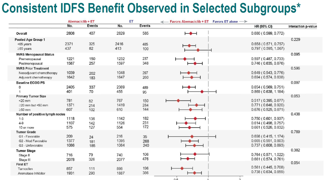 亚组分析显示,无论患者绝经状态、肿瘤组织学分级、既往化疗情况和阳性淋巴结数目,各亚组均可见与整体人群一致的IDFS获益趋势,与既往报告结果一致。