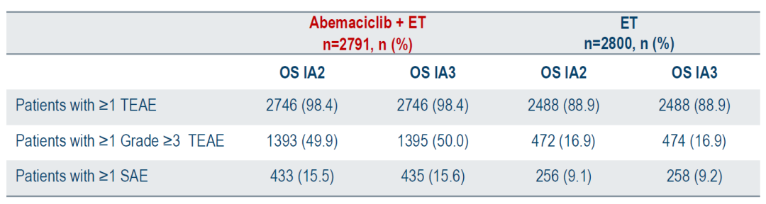 安全性方面,此次更新的数据与既往结果一致,阿贝西利联合内分泌治疗组和单纯内分泌治疗组相比较,任何级别治疗期间不良事件(TEAE)、≥3级TEAE及严重AE的发生率均相似。