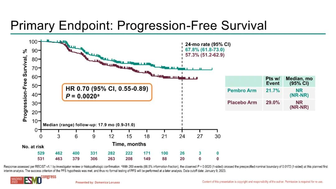 Dr. Lorusso:我在2023 ESMO上介绍了KEYNOTE-A18试验的首次中期分析结果。该研究首次评估了帕博利珠单抗或安慰剂联合同步放化疗(体外放射治疗[EBRT]加同步化疗并随后进行近距离放射治疗)在局部晚期高危宫颈癌中的作用。本试验报告了无进展生存期的显著且有临床意义的增加,帕博利珠单抗+同步放化疗相比安慰剂+同步放化疗可显著延长患者的PFS(HR=0.70,95%CI:0.55~0.89;P=0.0020),风险比为0.7,这表明疾病进展风险降低了30%,并且总生存期(OS)有增加的趋势,尽管总生存数据尚未成熟。