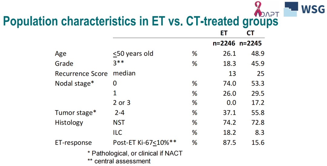 研究共入组的4491名临床高危早期HR+/HER2-乳腺癌患者中,单纯接受内分泌治疗组和接受化疗组患者约各占50%。在CT组中,组织学分级3级的患者约占45.9%,说明其具有更高的侵袭性。在组织学类型上,大部分患者均为浸润性乳腺癌(NST),在小部分浸润性小叶癌(ILC)患者中,ET组所占比例为18.2%,在CT组仅为8.3%。