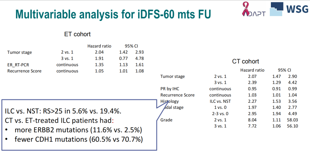 在整个队列中,肿瘤和淋巴结(T/N)分期、RS和孕激素受体(PR)表达是iDFS的预测因素。在接受ET亚组中,只有肿瘤T分期、RS和RT-pCR检测到的雌激素受体(ER)表达在COX分析中与预后显著相关。在接受CT的患者中,T/N分期、肿瘤分级、RS、组织学类型和PR表达均与预后显著相关。与NST相比,ILC的RS较低(5.6%vs.19.4%)。接受CT的高危ILC患者中ERBB2突变频率更高(11.6%vs.2.5%),但CDH1突变频率较低(60.5%vs.70.7%)。