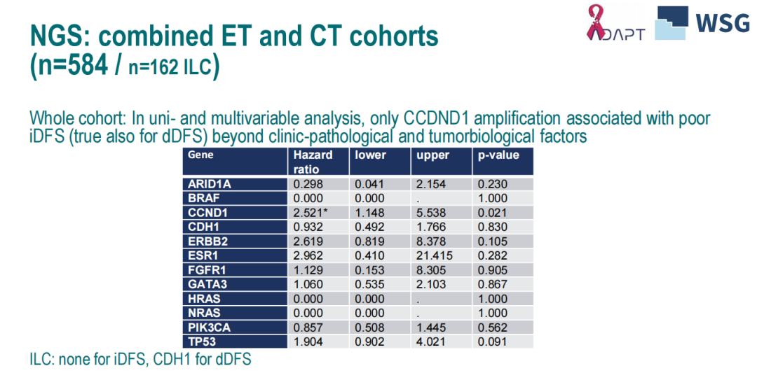 在二代基因测序(NGS)亚队列(n=584)中,只有CCND1扩增与更差的iDFS相关。