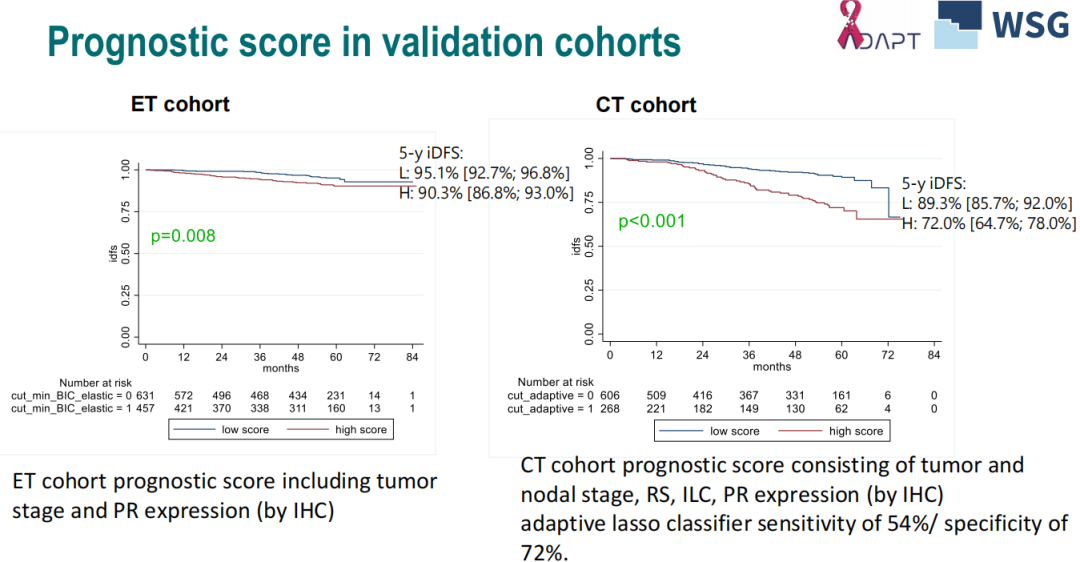 在ET队列中,仅基于T分期和PR表达构建预后评分。在CT队列中,由T/N分期、RS、ILC、PR表达构建的预后评分敏感度为54%,特异度为72%。基于T/N分期、年龄、RS、ILC、PR表达以及基线和内分泌治疗后Ki-67表达构建CT组预后评分,在验证集中其ROC曲线AUC值为66%。两个队列中,均看到了高危组和低危组患者的iDFS的差异(P=0.008 vs.P<0.001)。