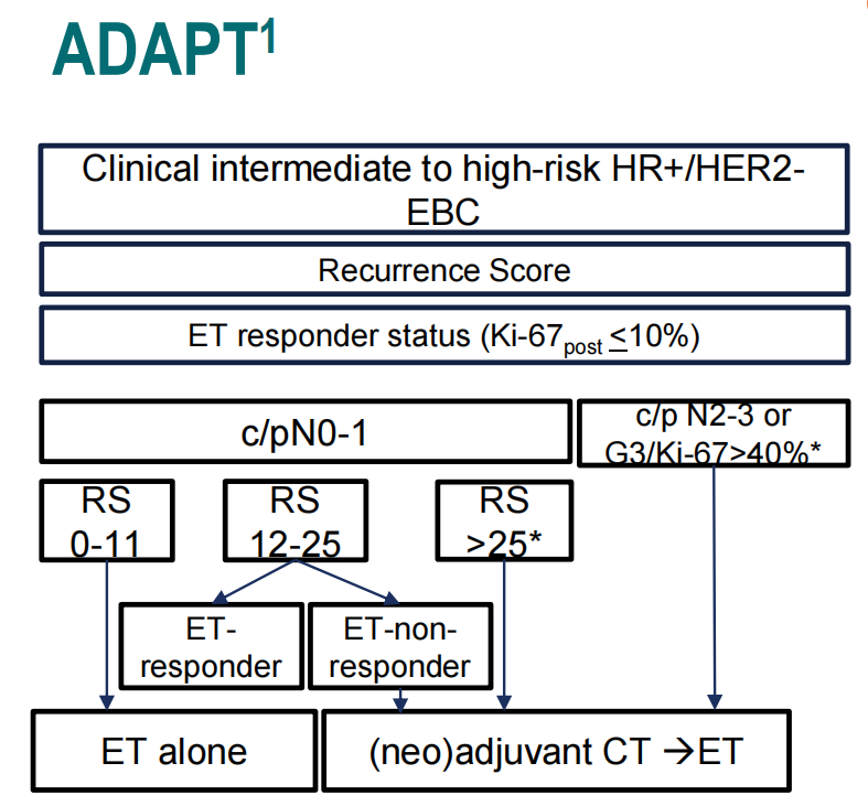 吴楠同学:ADAPT研究是西德研究组(WSG)针对全分子分型早期乳腺癌个体化降阶梯治疗及生物标志物探索的一项伞型研究,我们研究组对ADAPT系列研究一直非常关注,也陆续在肿瘤瞭望的平台分享过学习体会(华丽一族次第花开)。ADAPT HR+/HER2-系列研究对入组的早期HR+乳腺癌患者术前给予至少3周内分泌治疗,其中pN0-1、RS0-11或RS12-25且内分泌治疗有效,即内分泌诱导后Ki-67≤10%患者术后单独接受内分泌治疗,其余高危患者则接受化疗。本次大会更新的研究结果主要为该研究组构建了基于临床病理因素、RS、组织学类型等信息的多参数预后模型。结果显示,在单用内分泌治疗亚组中,只有肿瘤T分期、RS和ER表达与预后显著相关。在接受化疗的患者中,T/N分期、肿瘤分级、RS、组织学类型和PR表达均与预后显著相关。综上所述,我想请教老师,研究组是基于什么目的对HR+患者做预后模型的分析呢?