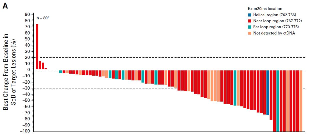 舒沃替尼治疗EGFR第20外显子插入突变的患者的瀑布图