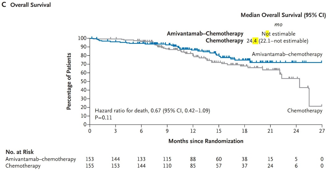 研究结果:从2020年12月至2022年11月,共计542例患者接受筛查,308例患者随机,联合Amivantamab治疗和单纯化疗组分别入组153例和155例患者。两组患者基线特点均衡可比,分别有92%和8%的患者基于组织及外周血检测结果入组。中位随访时间14.9个月,中位治疗持续时间分别为9.7个月和6.7个月。数据分析时,两组分别有46%和15%的患者仍然接受研究药物治疗。66%的化疗组患者交叉及接受Amivantamab治疗。
