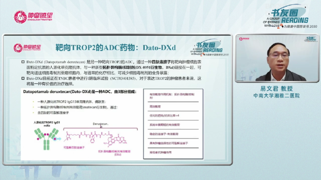 编者按:2023年11月8日19:30,西安交通大学第一医院杨谨教授(主持)与天津医科大学肿瘤医院贾勇圣教授(讲者)、中南大学湘雅二院易文君教授(讲者)共同做客《书友圈》,探讨Trop-2 ADC作用机制及临床应用的相关问题。