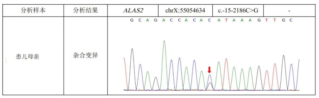 其母基因检测结果:ALAS2基因c.-15-2186C>G位点chrX:55054634存在杂合变异。