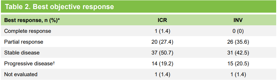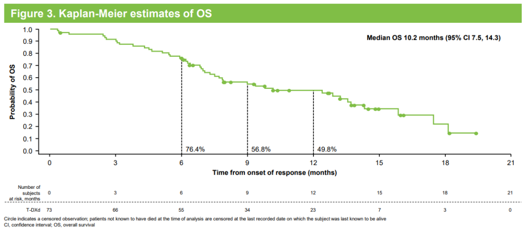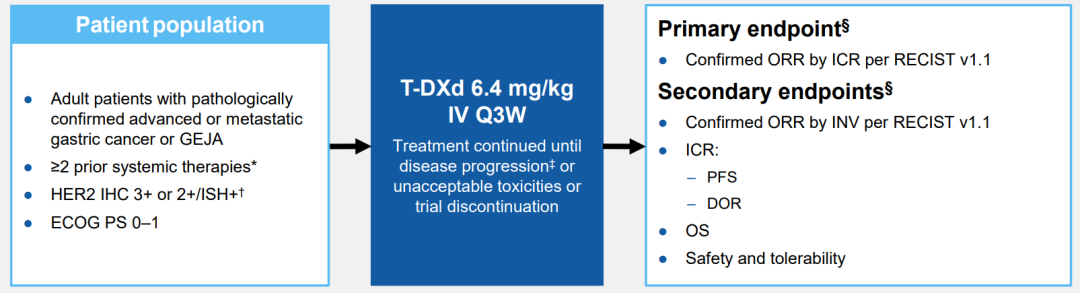 本项开放标签、单臂、II期试验(NCT04989816)对既往接受过≥2线治疗(包括氟尿嘧啶、铂类)的HER2阳性(IHC3+;IHC2+/ISH+)晚期GC/GEJA患者予以T-DXd 6.4 mg/kg静脉输注,每3周一次。主要研究终点为根据RECIST v1.1标准的独立中心审查(ICR)确认的客观缓解率(ORR)。次要研究终点包括研究者评估(INV)确认的ORR、缓解持续时间(DOR)、无进展生存期(PFS)和OS。