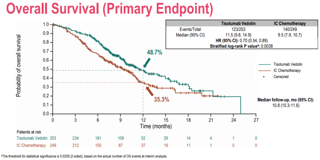 与化疗相比,TV组的死亡风险降低了30%(风险比[HR]=0.70;95% CI: 0.54~0.89;P=0.0038),中位OS显著延长;TV组和化疗组的中位OS分别为11.5个月(95% CI: 9.8~14.9)和9.5个月(95% CI: 7.9~10.7)。